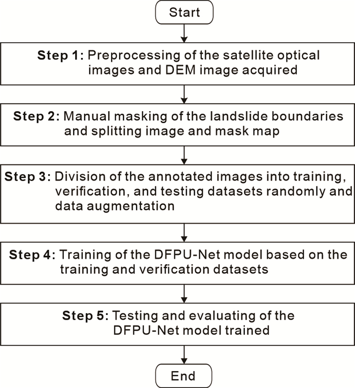 Landslides are widely distributed in mountainous regions around the world. Rapid mapping of earthquake-induced landslides in mountainous areas plays a crucial role in post-disaster assessment and rescue planning. In mountainous areas, it is challenging to identify small landslides using existing landslide mapping methods accurately. To address this challenge, this paper proposes a dual feature pyramid-based UNet (DFPU-Net) model, which utilizes the VGG16 model as the backbone feature extraction network. Meanwhile, two modified pyramid-structured modules, in terms of the atrous spatial pyramid pooling (ASPP) module and pyramid pooling module (PPM), are integrated into the backbone feature extraction network. Furthermore, the features of landslides extracted by the enhanced feature extraction network are screened by the deconvolution layers and convolutional block attention module (CBAM). To demonstrate the effectiveness of the proposed model, landslides in Grand'Anse and Sud departments, induced by the 2021 Haiti Mw7.3 earthquake, are mapped as a case study. The inputs adopted in this case study are satellite optical images, slope map, and normalized difference vegetation index (NDVI) map collected in this study region, and the estimated Precision, Recall, F1 score, Accuracy, and IoU of the landslide mapping results are 89.10%, 74.20%, 80.97%, 95.32%, and 68.02% respectively, indicating the effectiveness of the proposed model. The comparisons conducted show that the proposed model yields a higher Recall value than the existing models of UNet, DeepLab V3+, and PSPNet, thus, the superiority of the proposed model over the existing models is demonstrated.