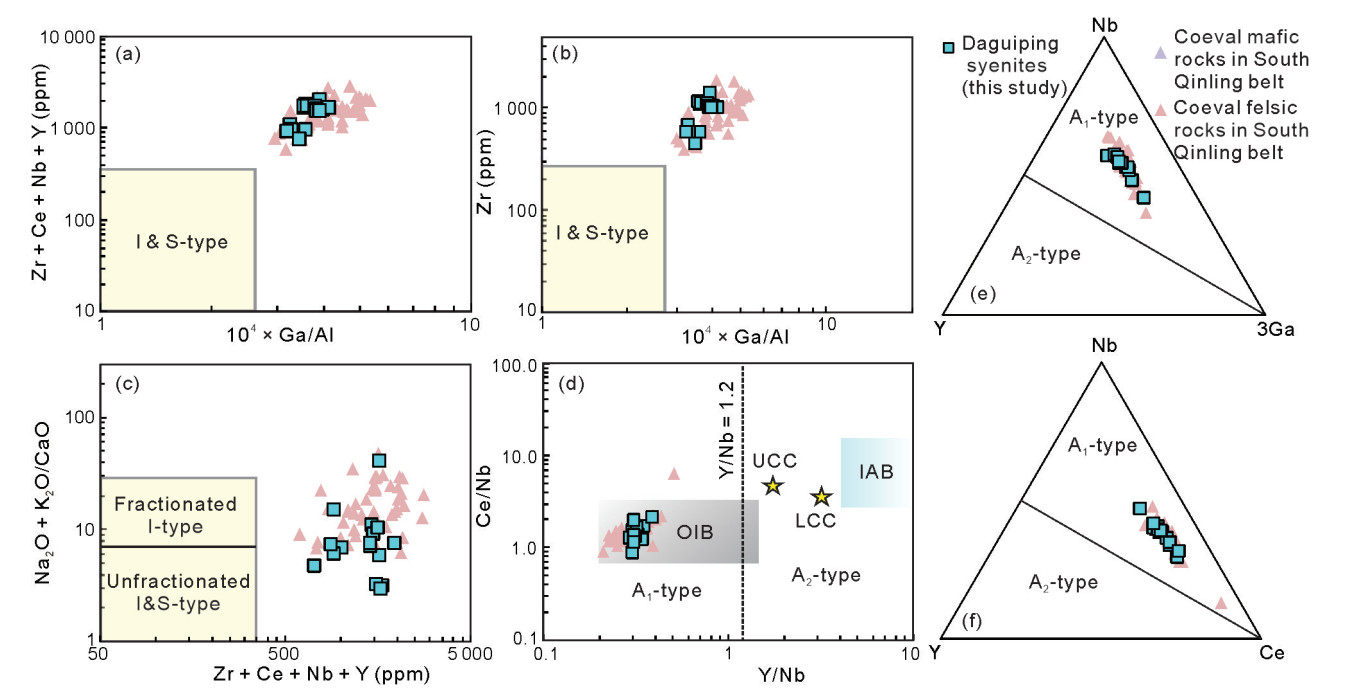 A-type rocks have drawn considerable attention in the past few decades due to their distinctive mineralogical and geochemical fingerprints and prospective utility for geodynamic reconstruction of the lithosphere. A comprehensive study, involving zircon U-Pb geochronology, whole-rock elemental and Sr-Nd-Pb isotopic geochemistry, was undertaken to elucidate the origin and evolutionary process for syenites from the Daguiping area in the North Daba mountains, South Qinling belt. The syenites revealed an Ordovician igneous crystallization age of 454.4 ± 17 Ma, coeval with the neighboring mafic rocks. All samples show high SiO2, LREEs, and HFSEs (Nb, Ta, Zr and Hf) contents, with negative to slightly positive Eu (Eu/Eu* = 0.78–1.08) anomalies. The geochemical characteristics of the Daguiping syenites imply that they are of A1-type magmatic affinity, which is confirmed by their high total alkali levels (8.57 wt.%–11.94 wt.%), Zr + Nb + Ce + Y contents (738.00 ppm–1 734.78 ppm), and 10 000 × Ga/Al ratios (3.25–4.22), as well as low Y/Nb ratios (0.30–0.40). Our samples exhibit a wide range of initial 87Sr/86Sr ratios of 0.701 943 to 0.709 802 and a narrow range of 143Nd/144Nd ratios of 0.512 205–0.512 246 with