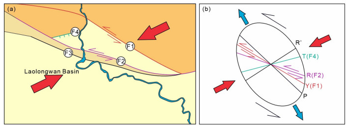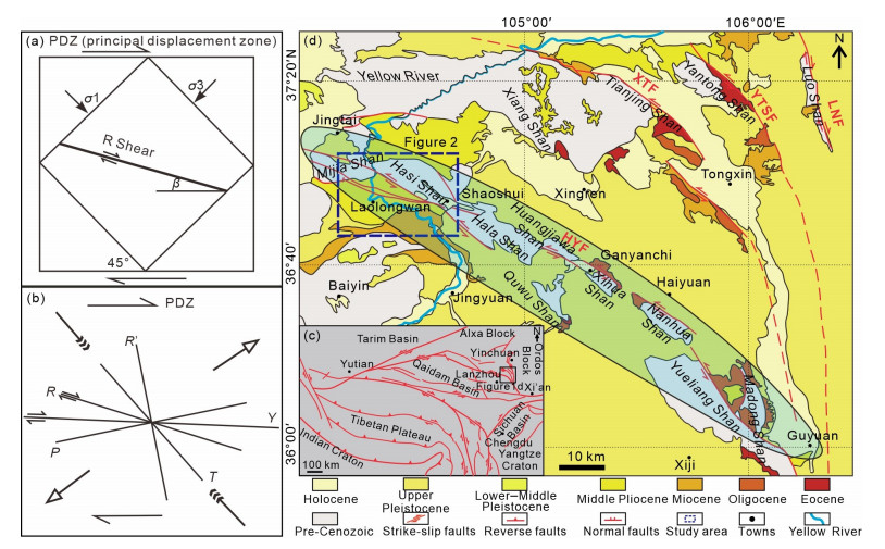 Riedel shear system, which consists of some different oriented faults and derivative structures, is an important pattern of tectonic activity and stress regulation, which has been widely applied to the interpretation of intracontinental deformation. The Laolongwan Basin, located in the western Haiyuan fault zone at the northeastern Tibetan Plateau, is a key area to study the Cenozoic intracontinental deformation in the northeastern plateau, which formed a complex active fault system during the Cenozoic. However, the activity of these faults and their kinematic mechanism remain unclear. In this contribution, based on detailed structural interpretation of remote sensing image, field observations and OSL dating analysis, we propose a Riedel Shear model of active fault system in the Laolongwan Basin. Our observations show that this active fault system consist of four major faults, including the left strike-slip Hasi Shan fault and Zihong Shan fault with thrusting characteristics, the Southern Zihong Shan thrust fault and the Mijia Shan normal fault. The fault offset and OSL dating analyses suggest that the left-lateral slip rate of the Hasi Shan fault is ~2.60–3.01 mm/a since ca. 15 ka, whereas the Zihong Shan fault is ~1.10–1.13 mm/a since ca. 14 ka. Fault-slip vectors analyses indicate that the active fault system related to the Riedel Shear in the Laolongwan Basin was controlled by the regional ENE-WSW compressive stress. This compression also caused the significant left-lateral strike-slip movement along the Haiyuan fault zone at the same time, which might result from the northeastward continuous expanding of the Tibetan Plateau during the Late Cenozoic.