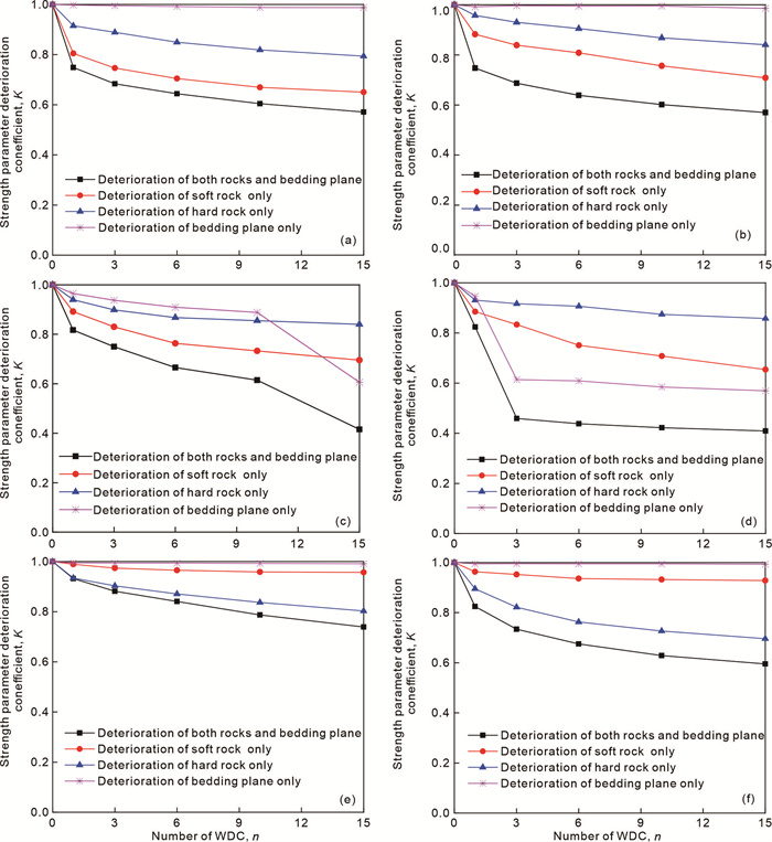The rock masses in the hydro-fluctuation zone of reservoir banks sustain wetting-drying cycles (WDC), thereby affecting the stability of the reservoir bank slope. In this paper, rock masses with argillaceous siltstone and silty mudstone interbedded in Badong Formation were taken as the research object to investigate the variation of strength parameters of soft and hard interbedded rock masses with WDC and dip angle through laboratory experiments and numerical experiments. Some attempts were made to reveal the mechanical properties deterioration mechanism of interbedded rock masses by quantitatively analyzing the contribution of strength parameters deterioration of hard rocks, soft rocks, and bedding planes to the strength parameters deterioration of rock masses. The results indicate that the logarithmic function could be used to describe the deterioration of each strength parameter of both argillaceous siltstone and silty mudstone and bedding plane with the number of WDC. The strength parameters of interbedded rock masses decrease as the number of WDC increases, with the largest decrease after the first cycle and then slowing down in the later cycles. The strength parameters initially decrease and then increase as the dip angles increase. The impact of deteriorated strength parameters of bedding planes and rocks on the deterioration of strength parameters of interbedded rock masses differs significantly with the dip angle, which can be divided into four typical ranges of different controlling factors.