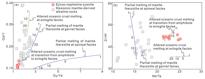 The cause resulting in alkaline rocks with superchondritic Nb/Ta ratios remains a geochemical enigma. This paper presents zircon and apatite geochronology, mineralogy, geochemistry, and Nd-Hf-Zn isotope investigation on the Ejinao nepheline syenite from South China to constrain the petrogenesis of alkaline rocks. The occurrence of alkaline minerals, including alkaline feldspar, arfvedsonite, and nepheline, indicate an alkaline feature of the Ejinao nepheline syenite. Zircon and apatite from the rock show U-Pb concordia age of 135.4 ± 0.9 and 137.5 ± 5.8 Ma, respectively, suggesting generation in the Early Cretaceous. The rock is characterized by low MgO (0.17 wt.%–0.26 wt.%) contents, but high Fe2O3T (4.66 wt.%–6.16 wt.%) and total alkalis (Na2O + K2O = 12.1 wt.%–13.1 wt.%) contents, consistent with the melts from subducting oceanic crust rather than mantle peridotite. The rock has low TiO2 (0.13 wt.%–0.21 wt.%) contents and superchondritic Nb/Ta and Zr/Hf ratios, resulting from rutile residue in the source area. The