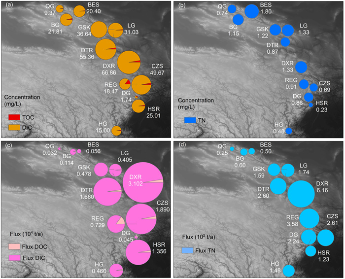 The carbon cycle stands as a cornerstone among the Earth's material cycles, carrying profound implications for global climate dynamics and humanity's sustenance and advancement. Additionally, nitrogen, as a vital nutrient element, plays a pivotal role in biogeochemical processes, exerting significant influence on the ecological environment within watersheds. In this study, an analysis of the carbon (C) and nitrogen (N) components in the river water of 12 alpine basins on the eastern margin of the Tibetan Plateau (TP) reveals that the average dissolved organic carbon (DOC) concentration in the river water is 0.76 ± 0.67 mg/L, indicating a lower level compared to the global river average organic carbon content. Specifically, the average DOC concentrations were 0.42 ± 0.22 and 1.56 ± 0.68 mg/L in the glacial and non-glacial basins, respectively. The average dissolved inorganic carbon (DIC) concentration in the eastern TP is 27.04 ± 20.19 mg/L, with the lowest DIC observed at Dagu Glacier and the highest at Daxia River. Furthermore, the average dissolved total carbon (DTC) concentration in glacier river water was 18.87 ± 12.65 mg/L, contrasting with 48.23 ± 21.07 mg/L in non-glacial basins. The mean concentration of total nitrogen (TN) in the eastern TP averaged 0.97 ± 0.54 mg/L, with the glacial basin registering 1.01 ± 0.47 mg/L and the non-glacial basin at 0.89 ± 0.70 mg/L. Evaluating the release fluxes of carbon and nitrogen across 12 river basins revealed a range of DTC emission fluxes from 0.32 × 109 to 31.02 × 109 g·C/a, with inorganic carbon comprising 71.0% to 99.5%. Consequently, the carbon emission flux for seven glacier basins totaled 15.91 × 109 g·C/a, while for the five non-glacial river basins, it reached 87.37× 109 g·C/a. The total TN release fluxes across 12 small river basins amounted to 2.46 × 109 g·N/a, with 0.84 × 109 g·N/a released in glacial basins and 1.62 × 109 g·N/a in the non-glacial basin. This study elucidates the spatial distribution and transport mechanisms of carbon and nitrogen elements within the glacial and downstream non-glacial basins, offering valuable insights into the biogeochemical cycles of carbon and nitrogen in the eastern Tibetan Plateau.