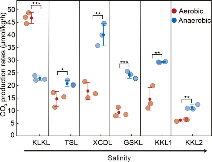 Global warming and human activities have reduced the concentrations of dissolved oxygen in the bottom water of lakes, resulting in increased anoxia in surface sediments. This increased anoxia likely alters carbon cycling processes (e.g., organic carbon mineralization) by altering microbial community composition and functions in lakes. However, it remains unclear how organic carbon mineralization responds to increased anoxia in surface sediments of lakes (particularly saline lakes). In this study, CO2 production in surface sediments of six lakes with different salinity (0.47–250 g/L) on the Tibetan Plateau was investigated using microcosm incubations under aerobic and anaerobic conditions, respectively, followed by geochemical and microbial analyses. The results showed that for the freshwater lake, CO2 production rates in anaerobic sediment microcosms were significantly (