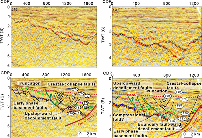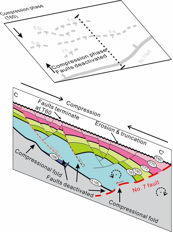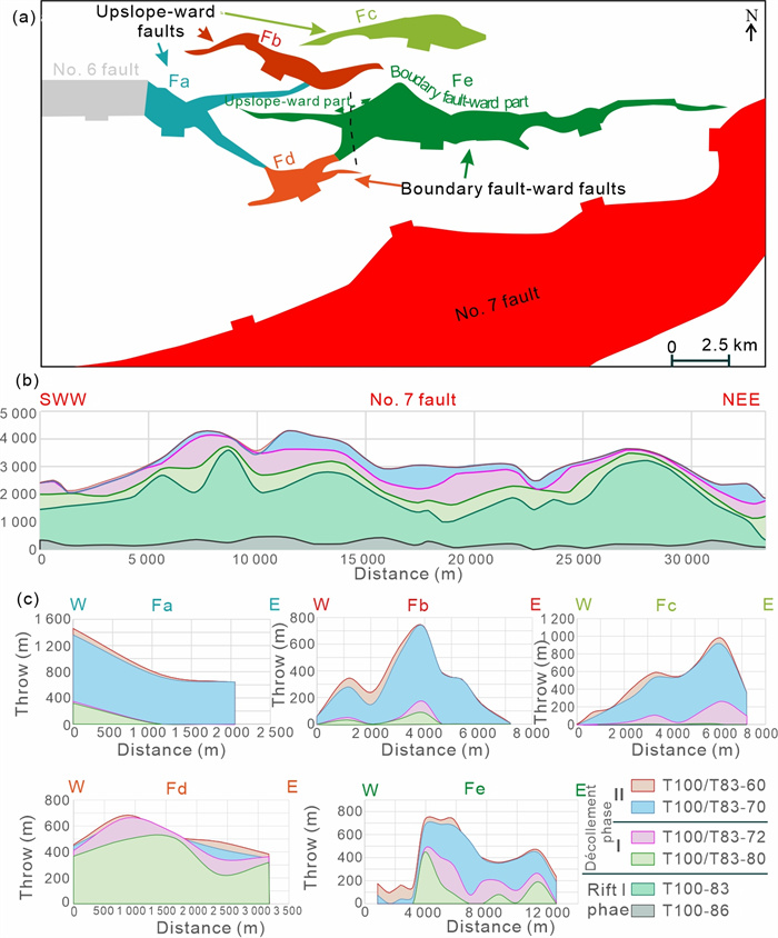 The Wushi sag is located in the central part of the Beibuwan Basin, northern South China Sea. Above the thick oily shale unit in the Wushi East subsag, a suite of terrace-like extensional décollement fault systems exists, which, in conjunction with the No. 7 boundary fault, control a complex fault system. This study integrates the high-resolution 3D seismic data and quantitative analysis of fault displacement to analyze the growth history of the complex fault system and to establish a model of fault system evolution in the Wushi East subsag. The findings reveal two phases of fault growth northward migration during the rifting process. The first phase occurred between the rift Ⅰ phase and the décollement Ⅰ phase, witnessing fault activity migrating northward from the No. 7 boundary fault to the décollement faults (Fd and Fe) in the hangingwall. The second phase occurred between the décollement Ⅰ phase and the décollement Ⅱ phase, with fault activity migrating further northward from Fd and Fe to Fa, Fb and Fd. By the end of the Oligocene, basin inversion controlled the syn- to post-rift transition of the Wushi East subsag. This study bears significant implications for hydrocarbon exploration and for understanding the mechanism underlying the syn- to post-rift process in the north continental marginal basins of the South China Sea.